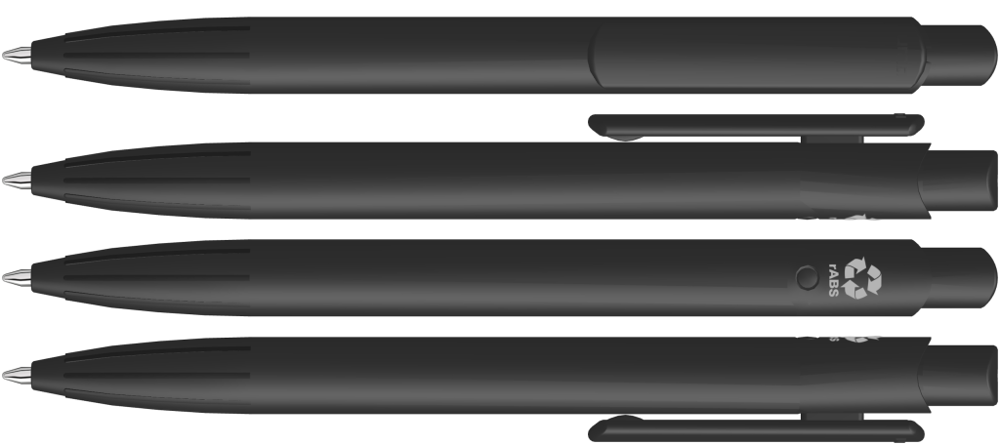 Retractable ballpoint pen with opaque matt housing, clip and push-button made from recycled ABS plastic. Integrated grip zone.