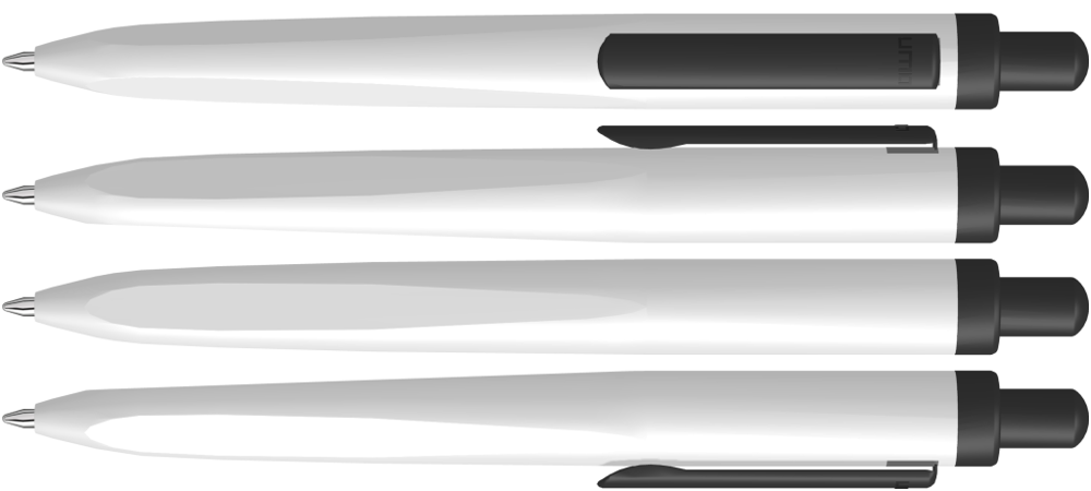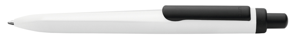 Metal retractable ballpoint pen with geometric changes in the barrel, tapers towards the writing tip into a striking triangular geometry. Matt lacquered aluminium housing. Metal clip and push-button matt black.
