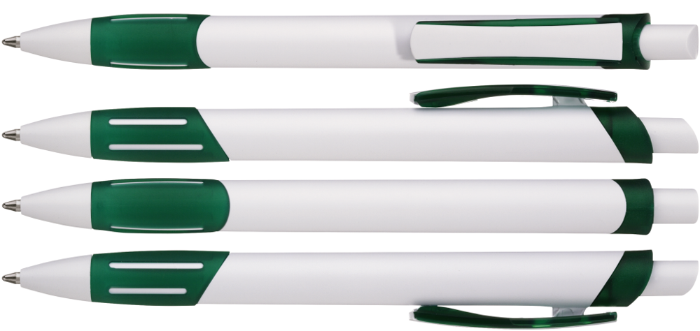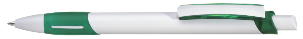 Retractable ballpoint pen with opaque housing in white, transparent frosted rubber grip zone, decorative ring and clip shell.