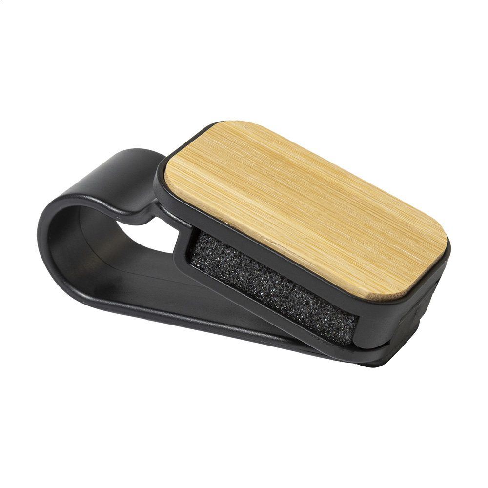 Practical car visor sunglasses holder clip in recycled ABS and bamboo.