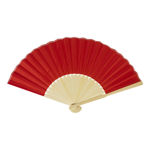 RPET polyester hand fan with bamboo ribs.