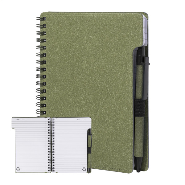 Recycled paper spiral notebook with 80 lined sheets. A6 size. Including recycled paper and recycled PP ballpoint pen with blue refill.