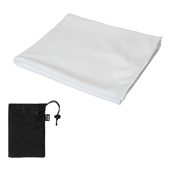 RPET microfibre sport towel in RPET non-woven carry pouch with distinctive RPET label. RPET polyester, 140 g/m².