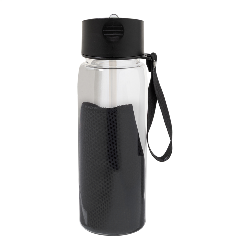 RPET polyester cooling sport towel in RPET sport bottle with PP flip-top drinking lid, integrated straw, and carry strap. 800 ml. BPA-free. Not suitable for carbonated drinks. Towel size: 30×80 cm.