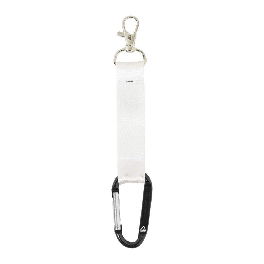 Custom made, RPET polyester mini keyring with sublimation printed graphics on both sides. With small metal and large recycled aluminium carabiners. MOQ: 100 pcs.