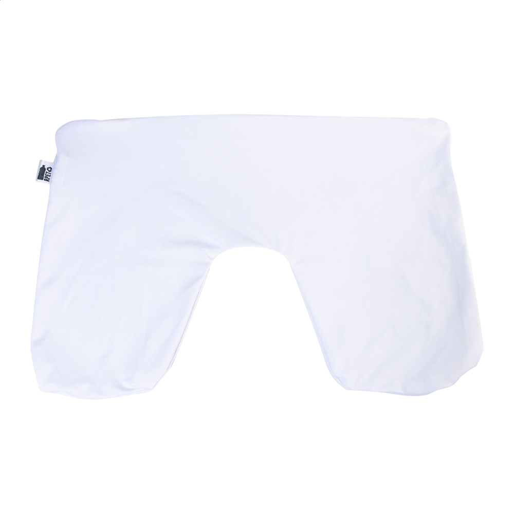 Custom made, inflatable microfibre travel pillow with zipped RPET cover featuring all over sublimation printed graphics. 92% RPET polyester and 8% elastane (185 g/m²), with distinctive RPET label. MOQ: 50 pcs.