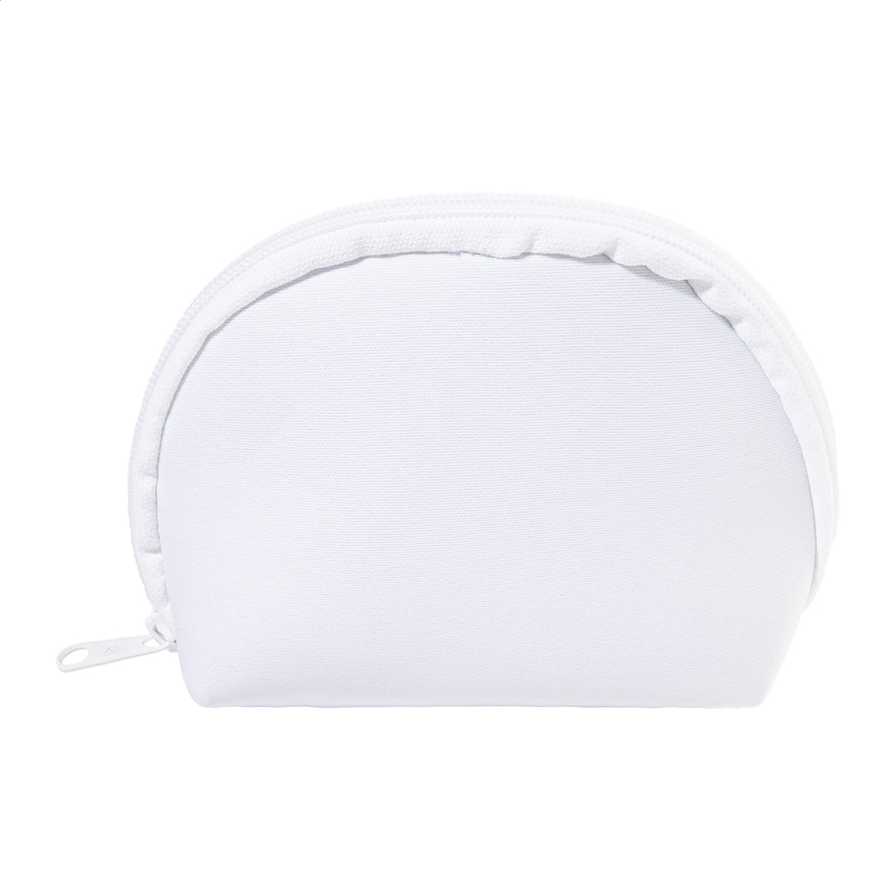 Custom made, zipped cosmetic bag in RPET neoprene. With distinctive RPET label and all over sublimation printed graphics. MOQ: 50 pcs.