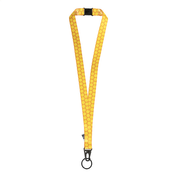 Custom made, RPET lanyard with black metal tactical style snap hook carabiner, keyring and safety buckle. With sublimation printed graphics on both sides. MOQ: 100 pcs.