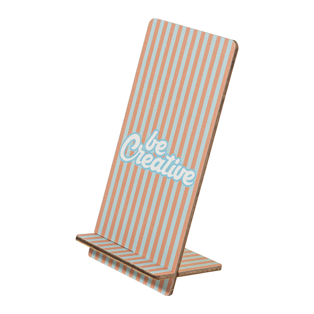 Custom made, full colour printed desk mobile phone holder in birch plywood. Price includes UV LED printing on front side. Delivered flat-packed. MOQ: 50 pcs