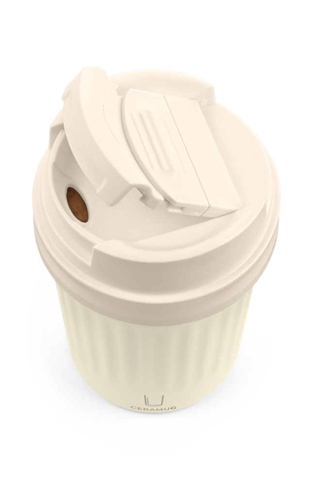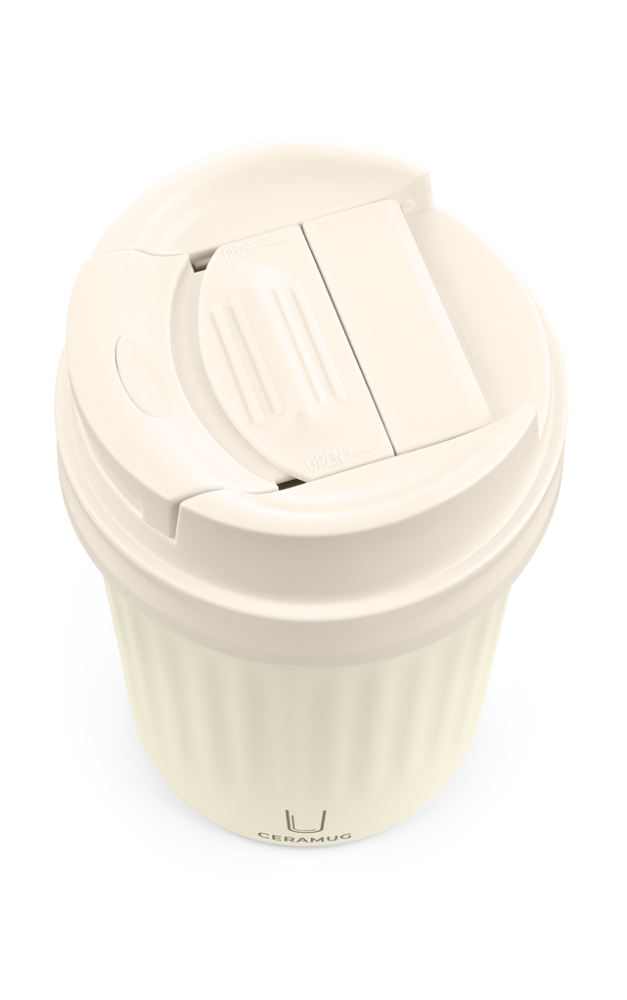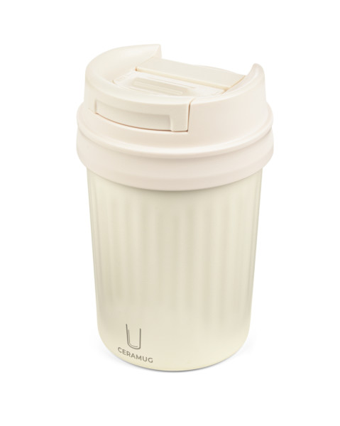Thermal mug for coffee and other hot drinks, double-wall vacuum insulation with WEILBURGER® ceramic coating on the inside, capacity: 300 ml, leak-proof plastic lid with integrated slide closure, ribbed look, 304 stainless steel, plastic, silicone, powder-coated, matt, white