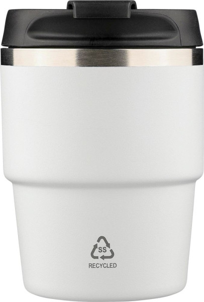 Recycled stainless steel double-walled vacuum mug (175 ml) with an interior of stainless steel 304 and exterior of stainless steel 201. Features a powder coating finish and a PP screw lid. Compact size fits under most coffee machines. Includes a laser-engraved recycled logo on the front. Individually packaged in a brown cardboard box.