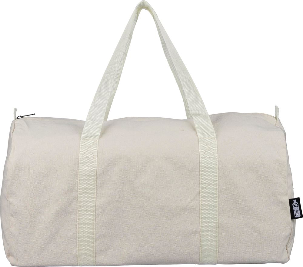 Recycled polycotton (330 gsm) duffle bag with large zippered top compartment. Features long carrying handles (100 cm length, 3 cm width) and matching webbing. Approx. 30 litre capacity. Includes rPET label on the outside and a recycled label inside.