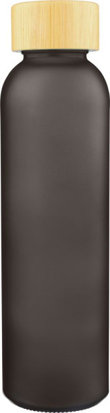 Glass drinking bottle (500 ml) with a frosted coated body and bamboo screw lid with PP inner core. Made from sodium calcium glass, suitable for cold drinks only. Individually packaged in a brown cardboard box.