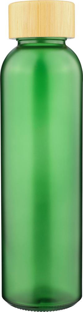 Glass drinking bottle (500 ml) with a frosted coated body and bamboo screw lid with PP inner core. Made from sodium calcium glass, suitable for cold drinks only. Individually packaged in a brown cardboard box.
