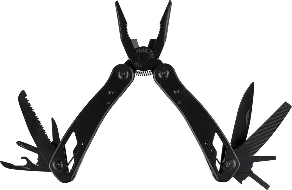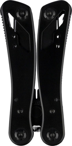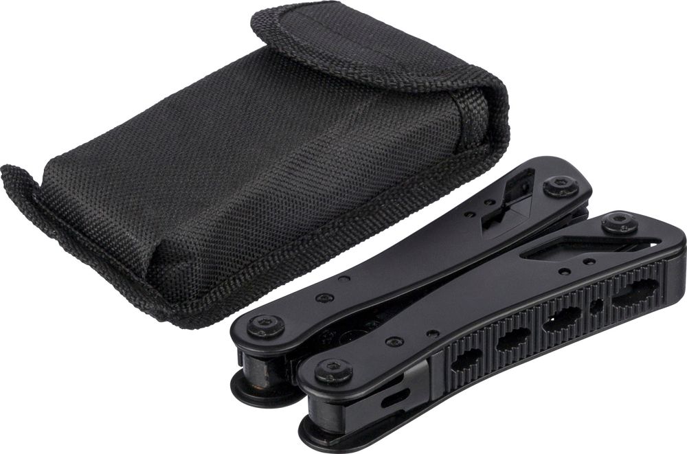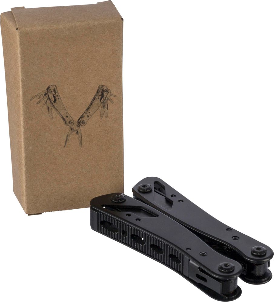 Black aluminium and stainless steel multitool with 13 functions including knives, screwdrivers, pliers, saw, file, lever, bits, spring, loop bar, can opener, and tang. Comes with a pouch featuring a velcro belt loop and additional outer box. Individually packaged in a brown cardboard box.