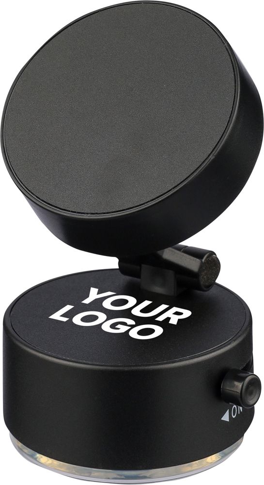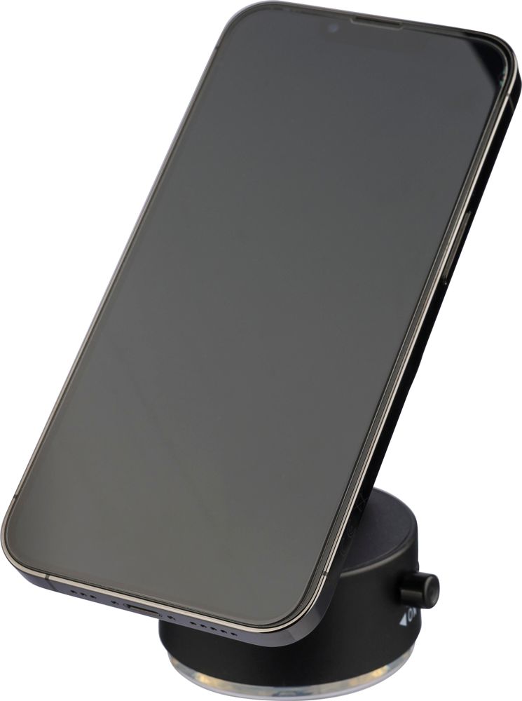 Recycled ABS MagSafe magnetic phone stand with suction cup base and lock function for secure attachment. Can be folded into a compact size. Includes a metal ring to ensure compatibility with all phone types. Recycled logo positioned between on and off. Ideal for use on smooth surfaces such as in the car. Individually packaged in a brown cardboard box.