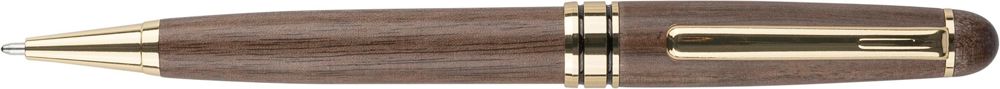 Walnut wooden and brass twist ballpen with metal tip, clip and trim. Fitted with German Dokumental ink in blue writing and an approximate writing length of 1,000 meters. Packaged in a maple wooden box and a brown cardboard box. Blue ink.