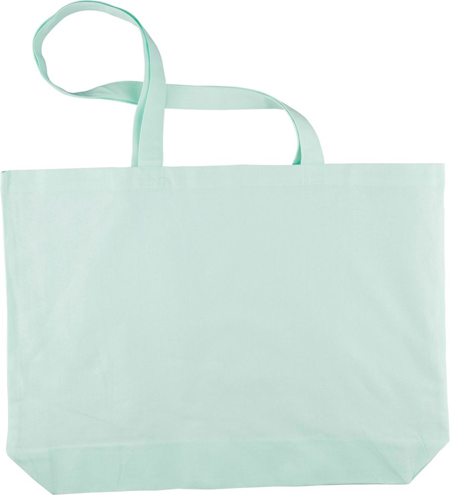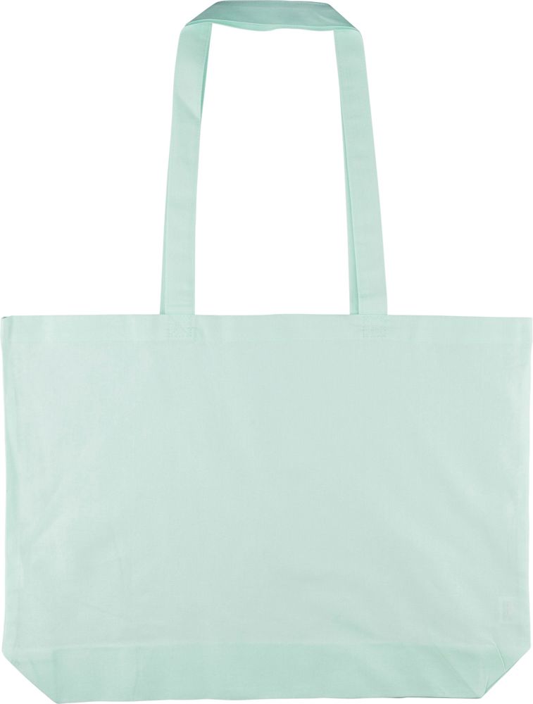 Cotton (140 gsm) shopping bag with 10 cm gusset and long handles (70 cm length, 2.5 cm width). Pastel-colored cotton in PMS 9562U (green), 162U (orange), 317U (blue), and 522U (purple). This product is OEKO-TEX® STANDARD 100 certified.