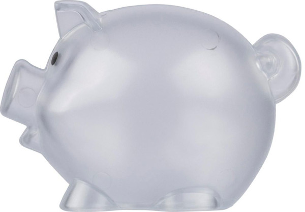 Recycled PS plastic piggy bank in pig shape. Transparent version with recycled logo on the backside.