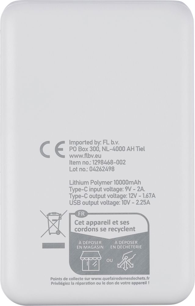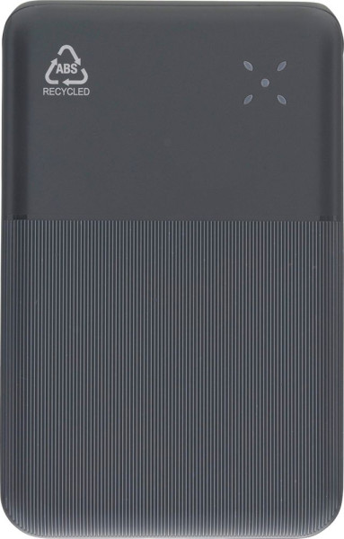 Recycled ABS powerbank with 20,000 mAh Li-ion battery and 22.5W fast charging. Features Type-C input and output, Type-A input, and an LED indicator for battery status. Equipped with protection against overheating, short circuit, overvoltage, and overcurrent. Includes label on the back with Recycled ABS logo. Individually packaged in a brown cardboard box with tissue paper inside.