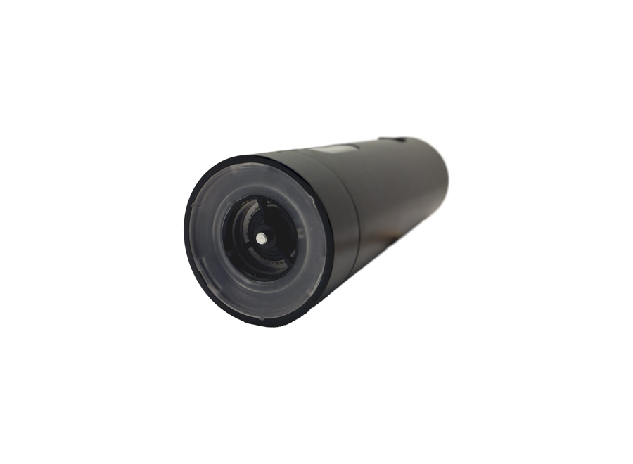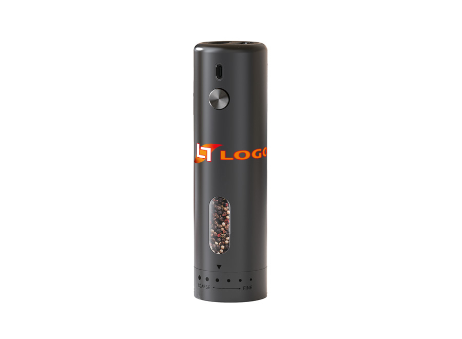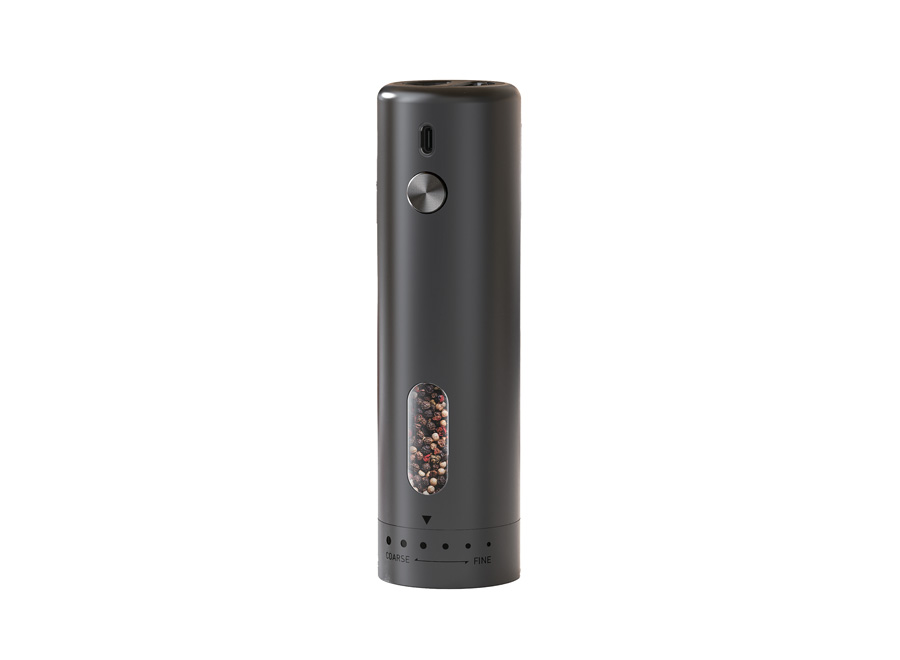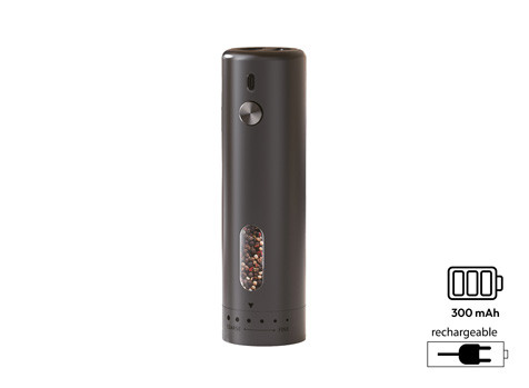 ABS body. Ceramic grinders offering 6 levels of grind coarseness. LED light under the mill and transparent casing. Reservoir capacity: 110 ml (60g of whole peppercorns). Works with 300mAh rechargeable battery. USB-C charging cable included.