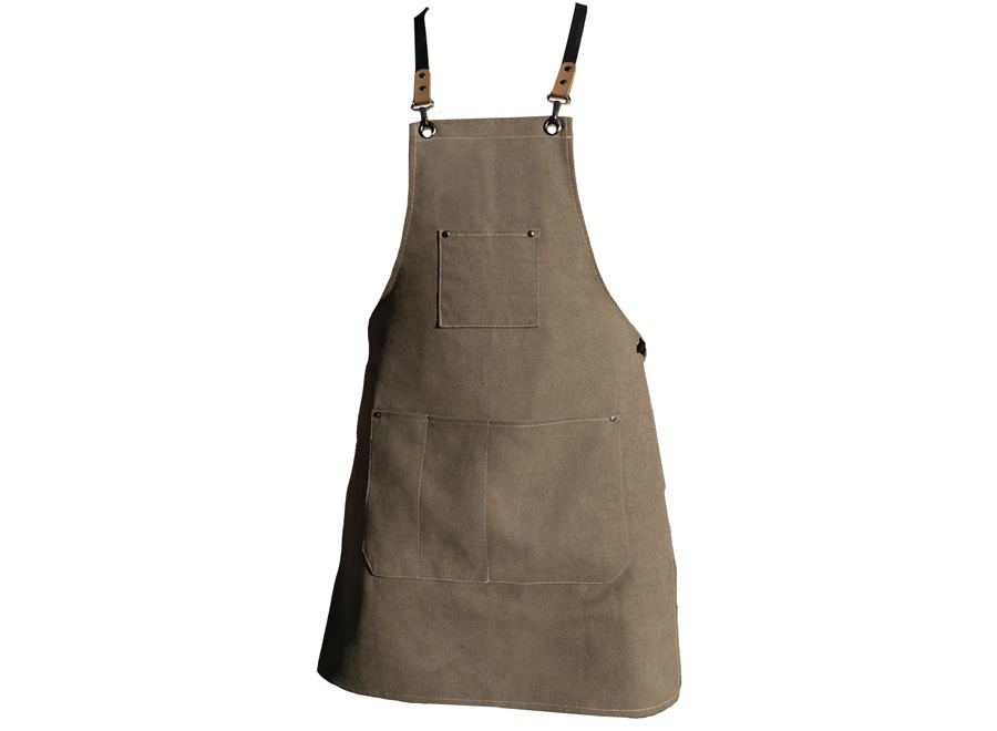 Apron made of thick 450 g/m² cotton. Beige topstitching. Metal rivets, eyelets and hooks. Polyester straps with faux leather inserts. 4 storage pockets (1 pocket: 12 cm deep × 10 cm wide / 3 pockets: 21 cm deep with widths of 8 cm, 8 cm and 17 cm).