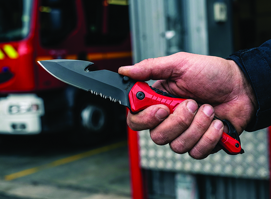 - Seat belt cutter with razor sharpening and window breaker in tugnsten carbide on this rescue knife for emergency situations.