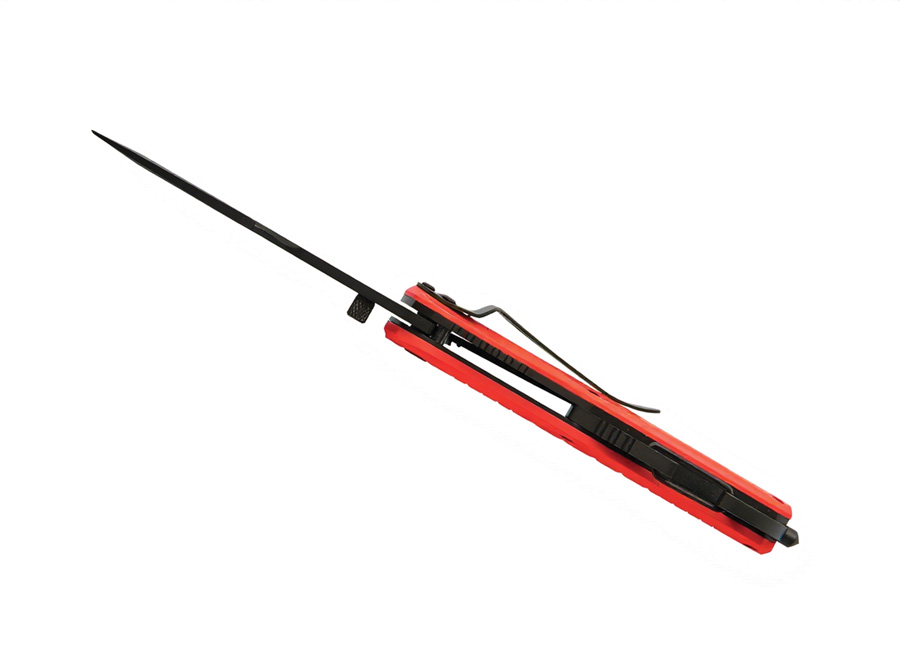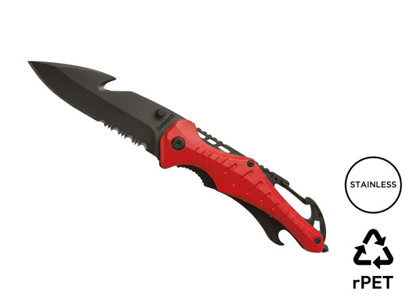 Folding pocket knife with a 420 stainless steel blade with titanium coating. Blade with a fine part (for precision cutting) and a micro-serrated part (for heavy duty task). Red anodized aluminium handle. One-handed opening/closing with a Liner lock safety system. Torx screw assembly. Seat belt cutter on the blade and window breaker hammer functions in tungsten carbide at the back of the handle. Bottle opener, carabiner and belt clip. Heather grey RPET pouch included.