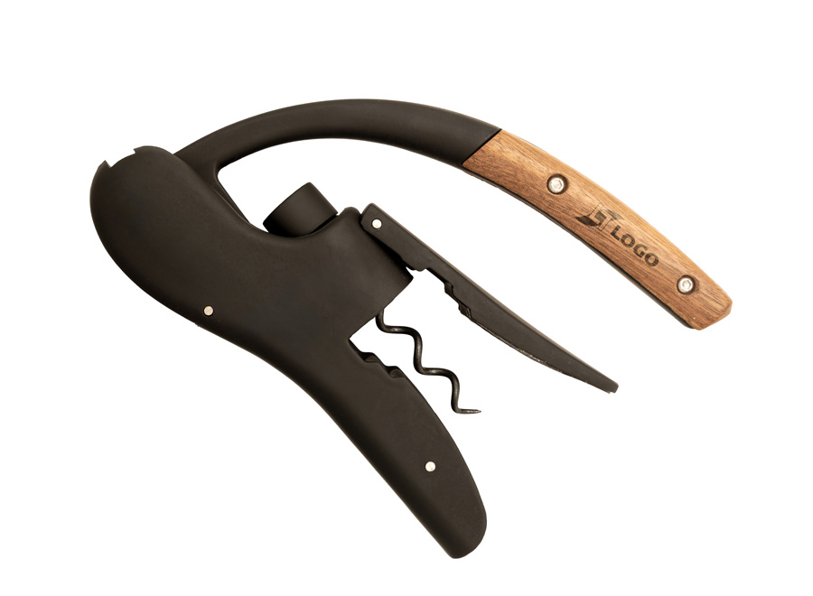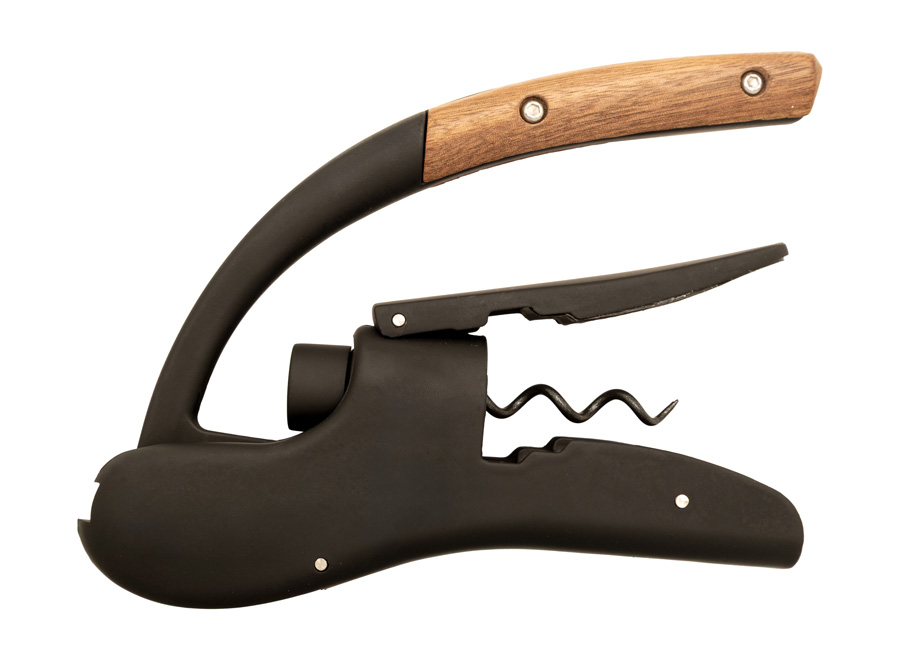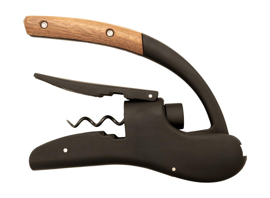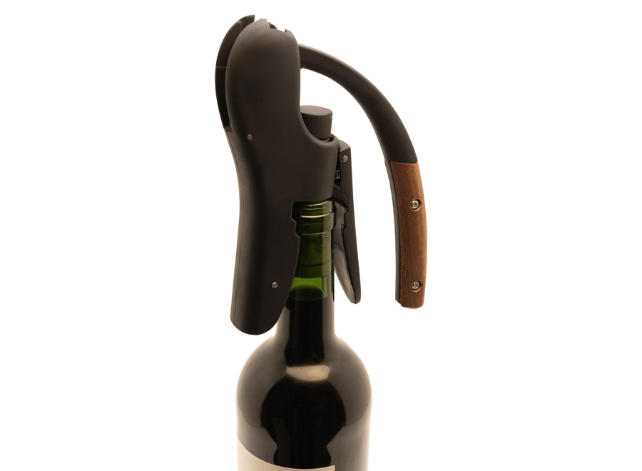 Zinc alloy structure coated with ABS offering a soft-touch rubber finish. Handle tip made of acacia wood. Stainless steel corkscrew end with a black non-stick coating. Dual support notches on the bottleneck, with a spring-loaded clamping handle and grippy inner coating. Rocking mechanism for smooth opening. Integrated lid cutter.