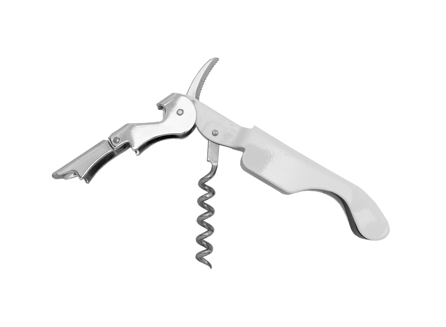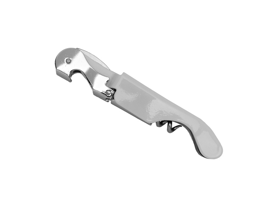 Professional two steps sommelier corkscrew. Stainless steel handle. 5 spirals stainless steel corkscrew end. Micro-serrated lid cutter. Quick bottle opener.