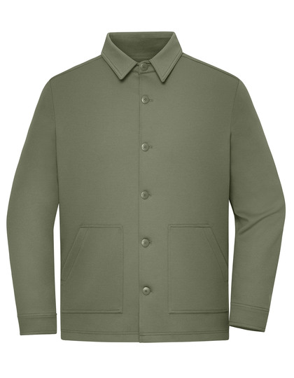 Elastic knit fabric made from a blend of organic cotton and recycled polyester | Pre-formed collar | Shoulder and back yoke | Patch pockets | Cuff fastening on the sleeves