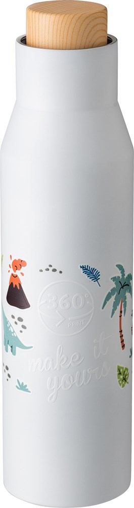 Stainless steel (s/s304) bottle (500 ml) with a double wall and a plastic lid with bamboo look. Individually packaged in a brown cardboard box.
