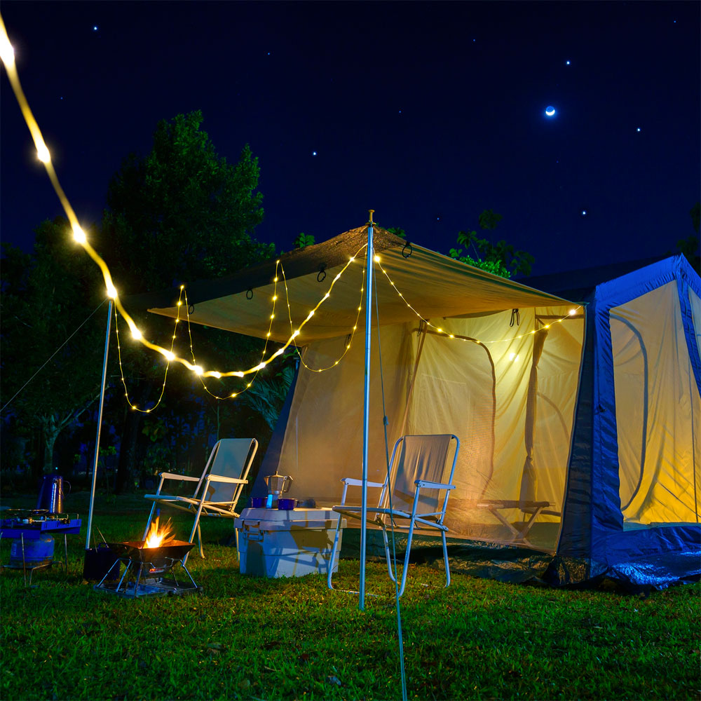 Schwarzwolf Hängelampe für Camping mit 3 Leuchtmodi: schwach, stark und rotes Blinklicht. Die Lampe enthält 24 weiße und 12 rote LEDs. Sie verfügt über eine integrierte 10 m lange Lichterkette, die beim Camping zur Dekoration des Zelts verwendet werden kann und eine romantische Atmosphäre in der Natur schafft. Spritzwassergeschützt gemäß IPX4. Verpackt in einer Geschenkbox.