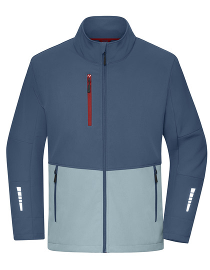 Elastic, durable softshell material with TPU membrane, woven outer fabric, fleece lining | Windproof and water-repellent (8,000 mm water column) | Breathable and water vapour permeable (2,000 g/m²/24h) | Stand-up collar | Fully lined zip with chin guard | Elasticated inner cuffs | Extended back section | 2 zipped side pockets | 1 zipped breast pocket | 1 zipped inside pocket | Drawstring for width adjustment at the hem | Reflective elements (without protective function/no PPE) on the back and sleeves | Zips: YKK