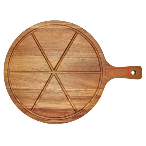 Pizza set made of acacia wood. The set includes a pizza serving board with 6 grooves to slice and portion, and a pizza cutter.