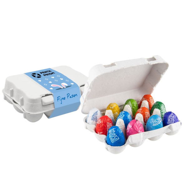 Egg carton with full color printed wrapper filled with 12 Tony Chocolonely Easter eggs in assorted flavors