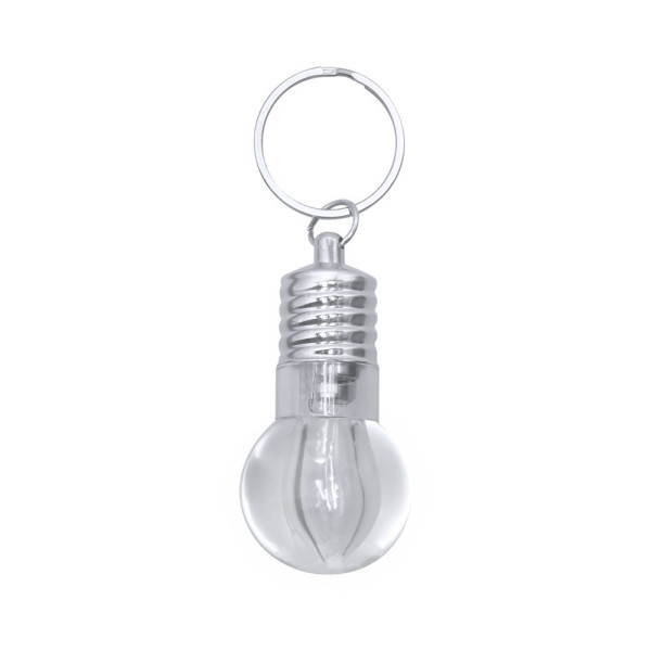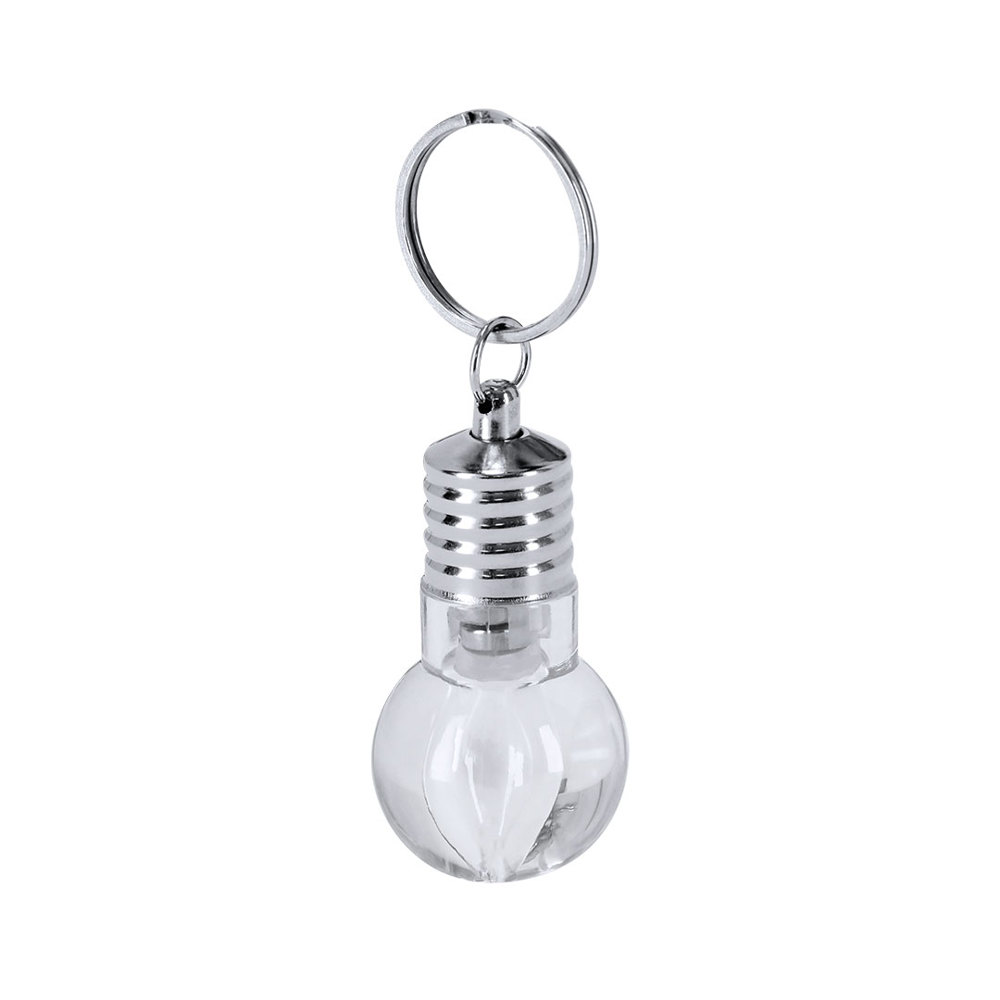 Keychain flashlight with original bulb-shaped design. With 1 LED powered by button batteries (included) with on/off button on the side and decorative elements and chrome ring.