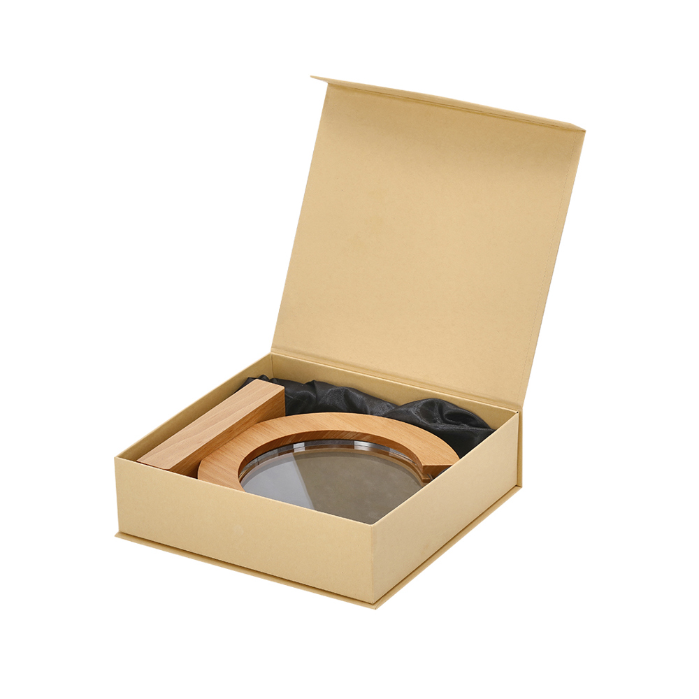 Trophy plate made of thick glass with an elegant circular design with a wooden base. Ideal for personalized gifts, recognitions, awards and decoration. Presented in an individual protective case in a Kraft finish.