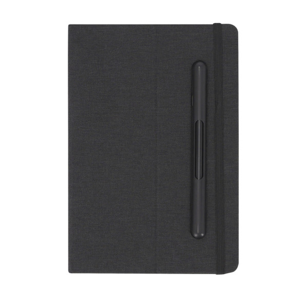 Notepad stand with rigid covers made of 600D RPET. Versatile support integrated into the cover. Includes eternal pencil pen. Contains 96 inner sheets available with a stripe. It has an elastic closure. With RPET logo.