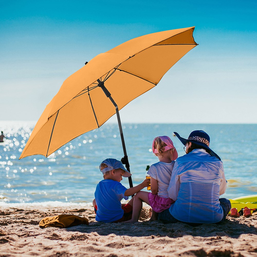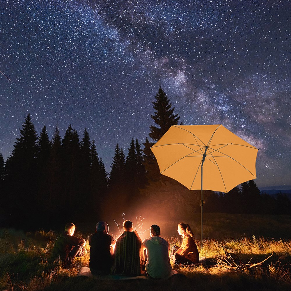 Modern parasol with frame in a titanium finish and tilt mechanism Simple handling with safety runner, very solid fibreglass ribs, two-piece and progressively height-adjustable shaft with with tilt mechanism to angle the umbrella, shaft in an elegant titanium finish, lower shaft approx. 120 cm long and twist lock to fix securely, convenient carrying case, high-quality cover with a grammage of approx. 200 g/m² and UPF 50+ sun protection factor, excluding parasol base (Art. 8920 or Art. 8905) / ground spike (Art. 8939)