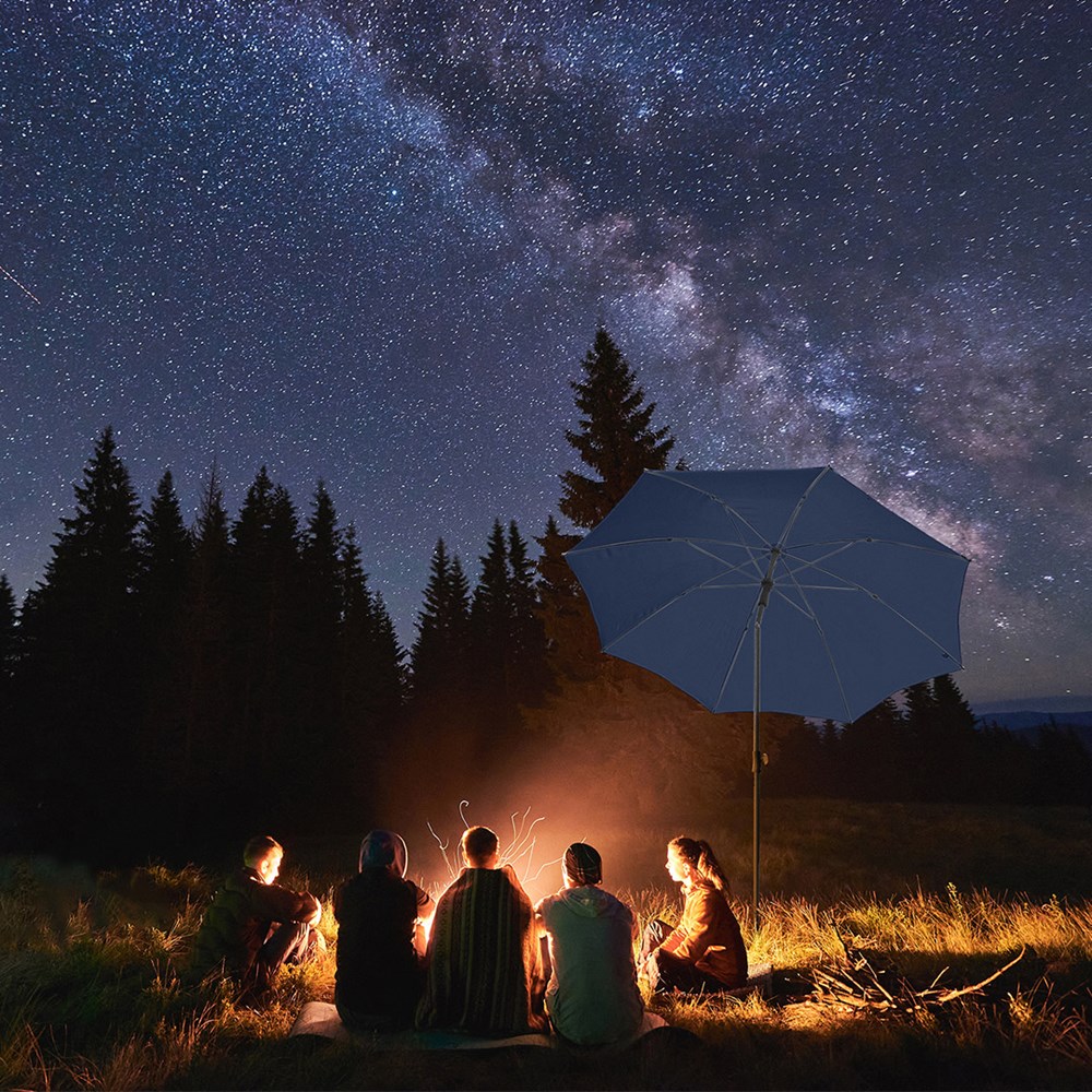 Modern parasol with frame in a titanium finish and tilt mechanism Simple handling with safety runner, very solid fibreglass ribs, two-piece and progressively height-adjustable shaft with with tilt mechanism to angle the umbrella, shaft in an elegant titanium finish, lower shaft approx. 120 cm long and twist lock to fix securely, convenient carrying case, high-quality cover with a grammage of approx. 200 g/m² and UPF 50+ sun protection factor, excluding parasol base (Art. 8920 or Art. 8905) / ground spike (Art. 8939)