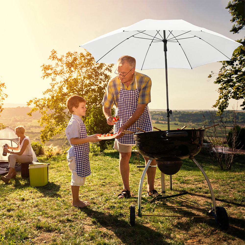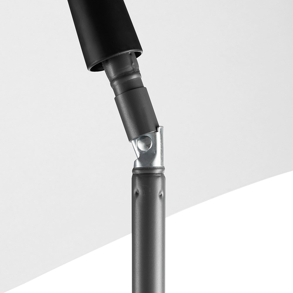 Modern parasol with frame in a titanium finish and tilt mechanism Simple handling with safety runner, very solid fibreglass ribs, two-piece and progressively height-adjustable shaft with with tilt mechanism to angle the umbrella, shaft in an elegant titanium finish, lower shaft approx. 125 cm long and twist lock to fix securely, convenient carrying case, high-quality cover with a grammage of approx. 200 g/m² and UPF 50+ sun protection factor, overlapping ventilation cover to regulate pressure in stronger gusts, excluding parasol base (art. 8920)