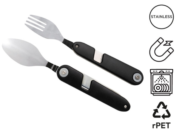 Food-grade 420 stainless steel folding travel cutlery set. Aluminium handle. Magnetic system to split the product into two parts and form a fork and a knife (or a spoon). 5 functions: knife, fork, spoon, bottle opener, can opener. Heather grey RPET pouch included.