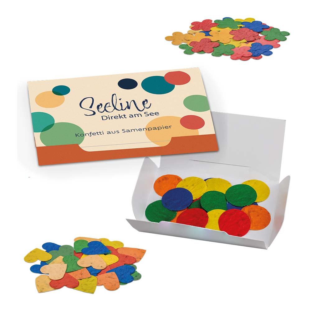 There's always something to celebrate! Our seed paper confetti not only creates a festive atmosphere, but also encourages the growth of beautiful flowers. The seeds of a colorful flower mix are already embedded in the biodegradable paper. This eco-friendly promotional gift is ideal for anniversaries, parties, events, and any occasion where joy and sustainability go hand in hand. The 20 seed paper pieces are available in round, heart, or flower shapes (each with a single seed variety) and come in a mix of red, green, blue, orange, and yellow. Rain or watering quickly dissolves the paper, and the seeds begin to germinate. Packaged in a handy credit card format that can be personalized, it's a charming giveaway with a sustainable message.