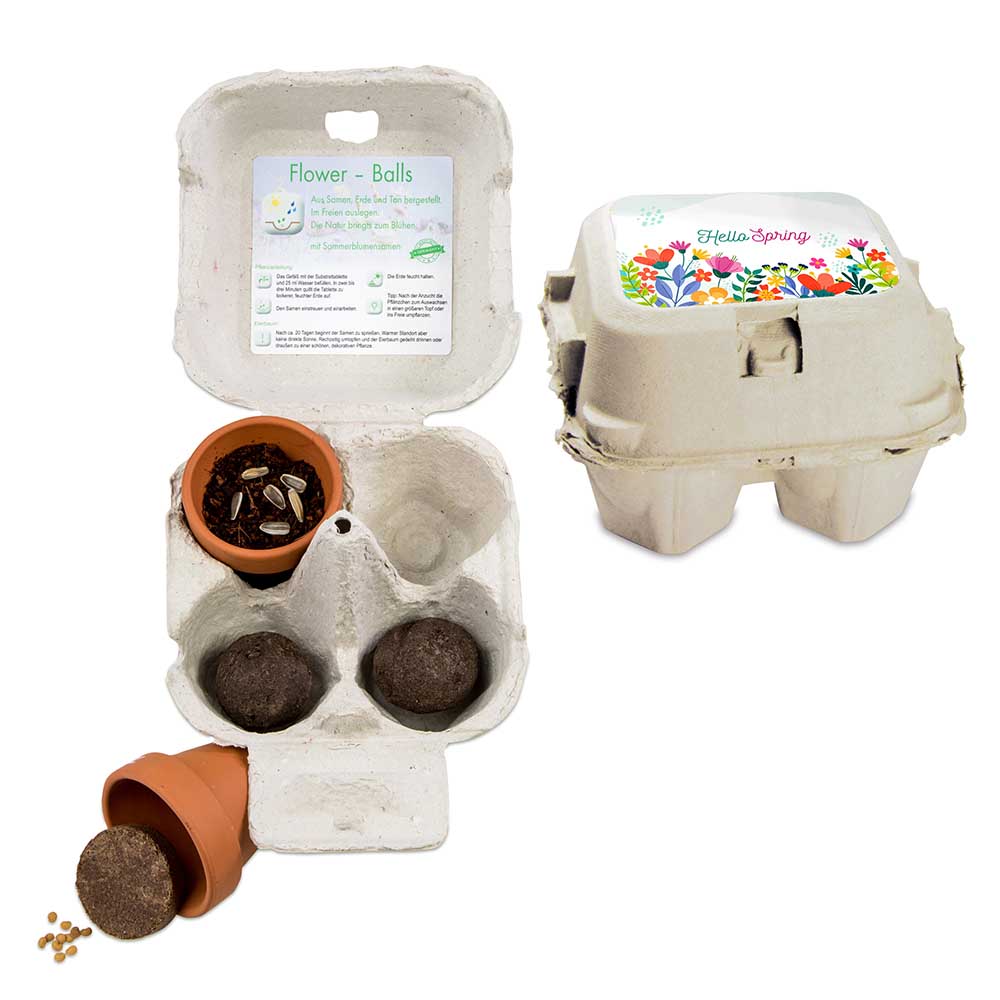 It is blooming and blossoming in the office and outside - this combination is contained in this promotional product. Packed in the original egg crate with large, individual advertising sticker on the outside. The customer receives two clay pots with egg tree and sunflower seeds for the flower greeting on a desk or windowsill. In order to bring food for the bees and butterflies to the outside, two additional flower-balls - small balls consisting of seed, soil and clay powder - are supplied. These are distributed arbitrarily and directly on the ground and motivate the recipient to become active in the style of guerilla gardening.