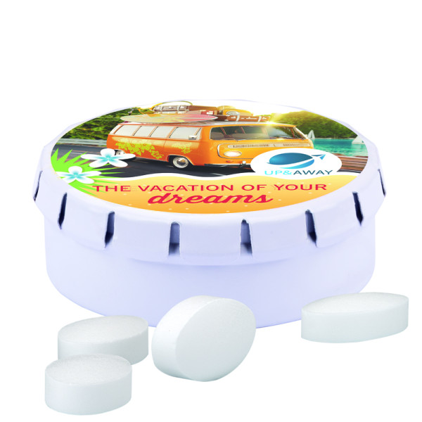 Small round tin with a spring-loaded lid, made of metal, white, with an original fastener and tear-off perforation. Tinplate 98% recyclable, individually printed. Content: Pfeffi peppermint pastilles, sugar-free, 10 g