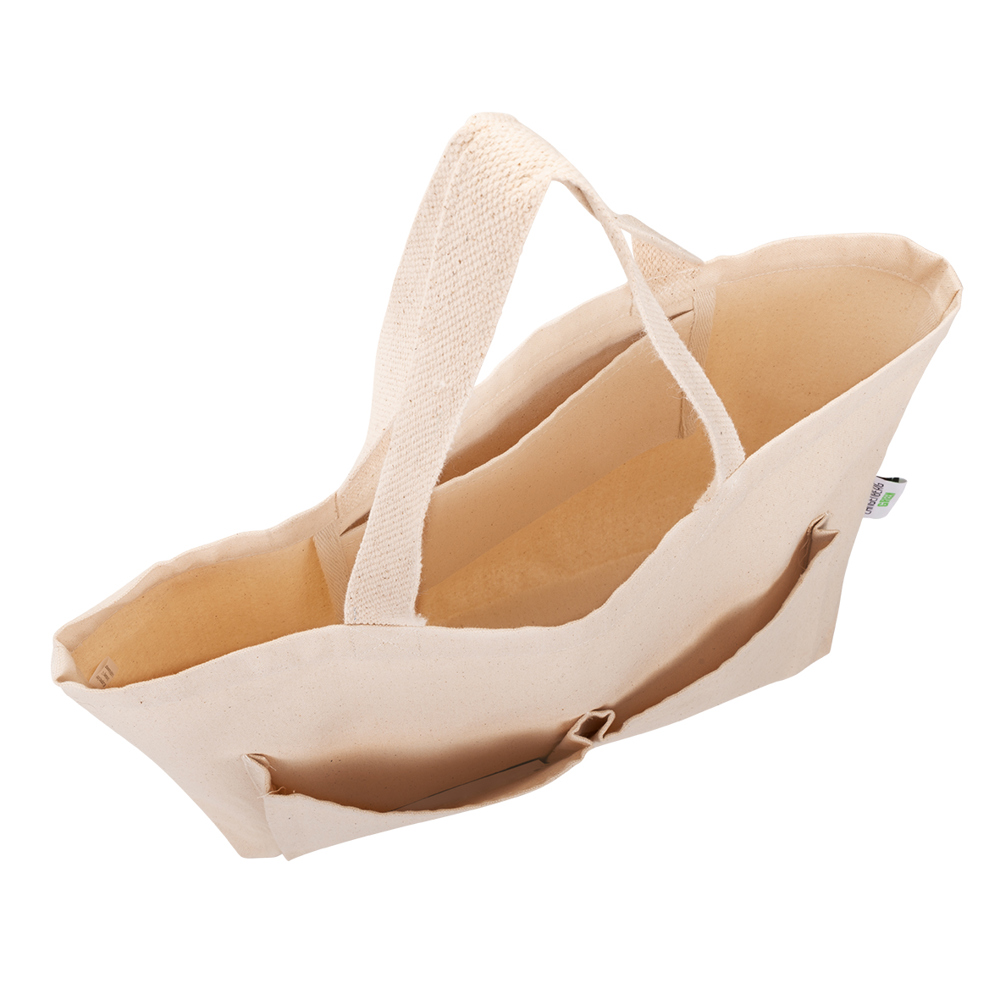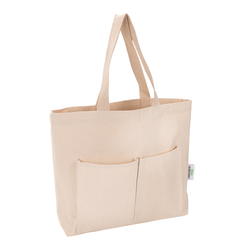 The leisure bag offers practical storage with an open main compartment, an open interior pocket, and two open front pockets for easy access. The sturdy canvas handles ensure comfortable carrying.