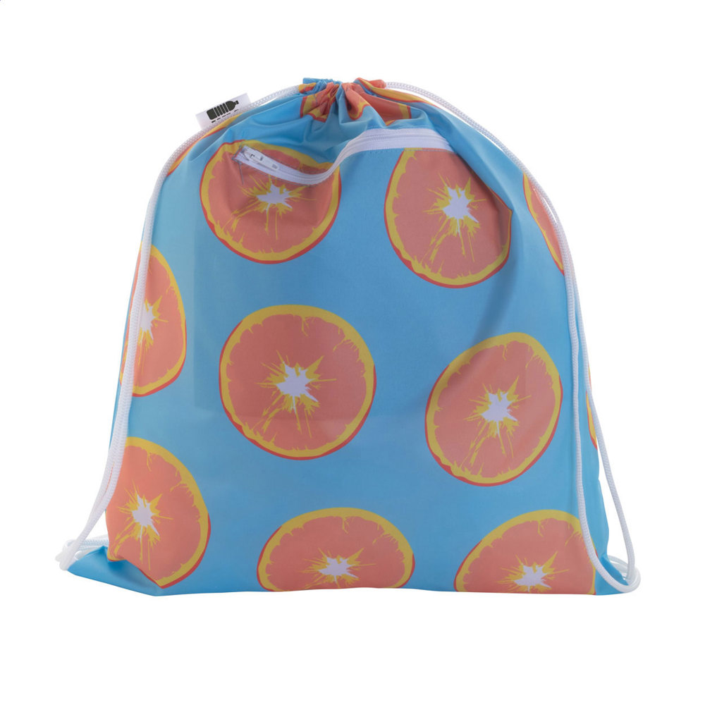 Custom made drawstring bag with zipped, RFID protected front pocket, 190T RPET polyester. With all over sublimation printed graphics and distinctive RPET label. MOQ: 25 pcs.