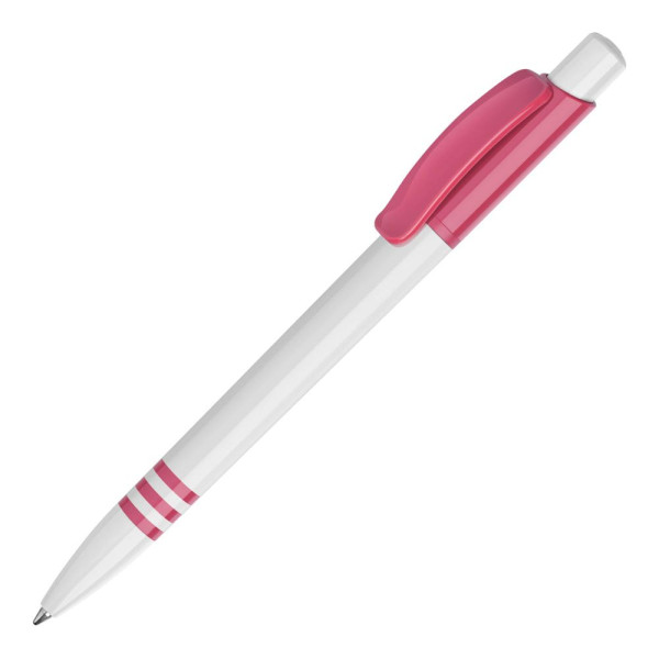The Tropic ball pen in hardcolour has a large imprint space on both, clip, and barrel. With a combination of a white barrel and pusher and a coloured clip. The barrel has three coloured rings in the same colour as the clip. Includes a pusher mechanism and a blue writing Jumbo refill. The pen is made of ABS plastic and is made in Europe. From orders of 5.000 pieces, you can choose your own colour combination.