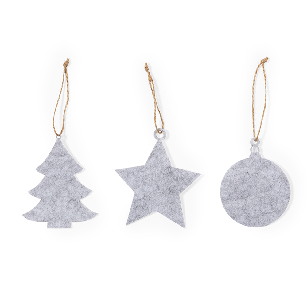 Christmas ornaments set of 3 pieces, made in soft felt. Including 3 designs: Xmas Tree, Star, and Ball. All the ornaments with hanger. Presented in a recycled paper bag.